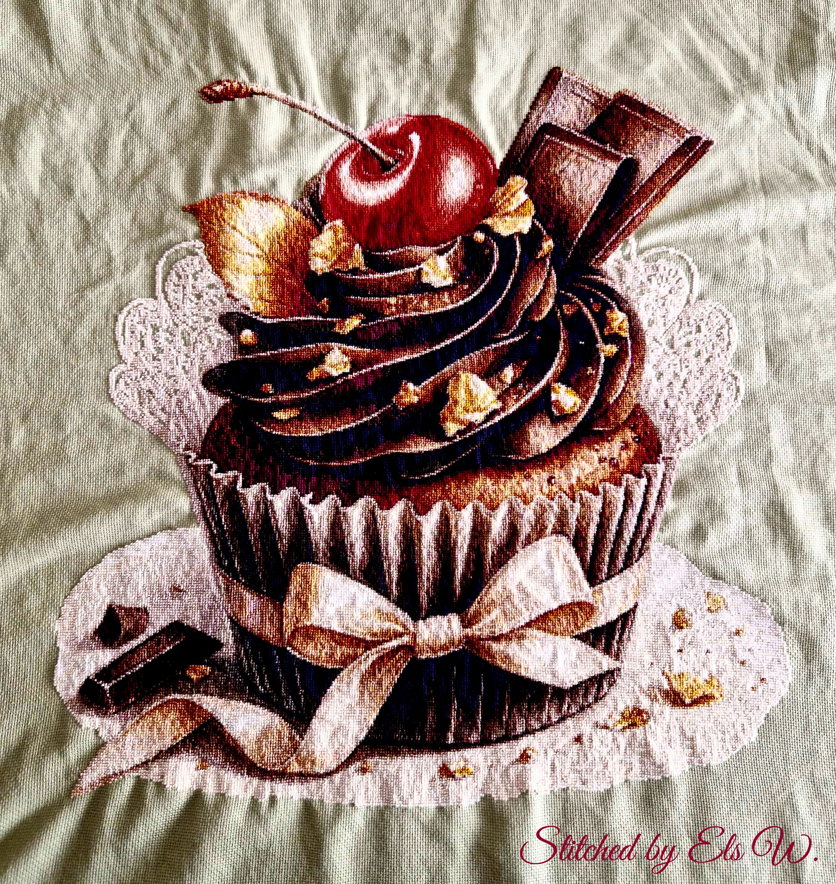 Create some delicious art with this Chocolate Cherry Cupcake cross stitch pattern adapted from art by digital artist Dream Cafe Art, who uses a variety of photo editing tools including AI to create unique scenes. This elegant design includes a delicate lacy filigree wrapper, gold leaves, and a maraschino cherry. It's way too pretty to eat! Don't let the size scare you - because there's no background, the actual number of stitches is only 65,214.