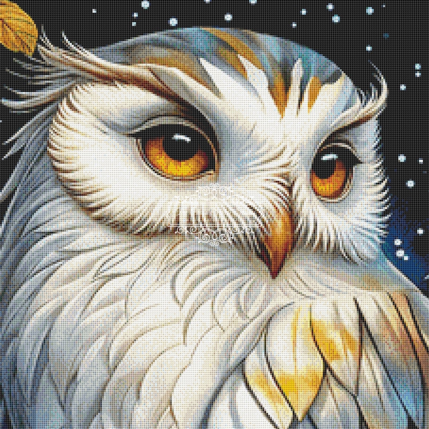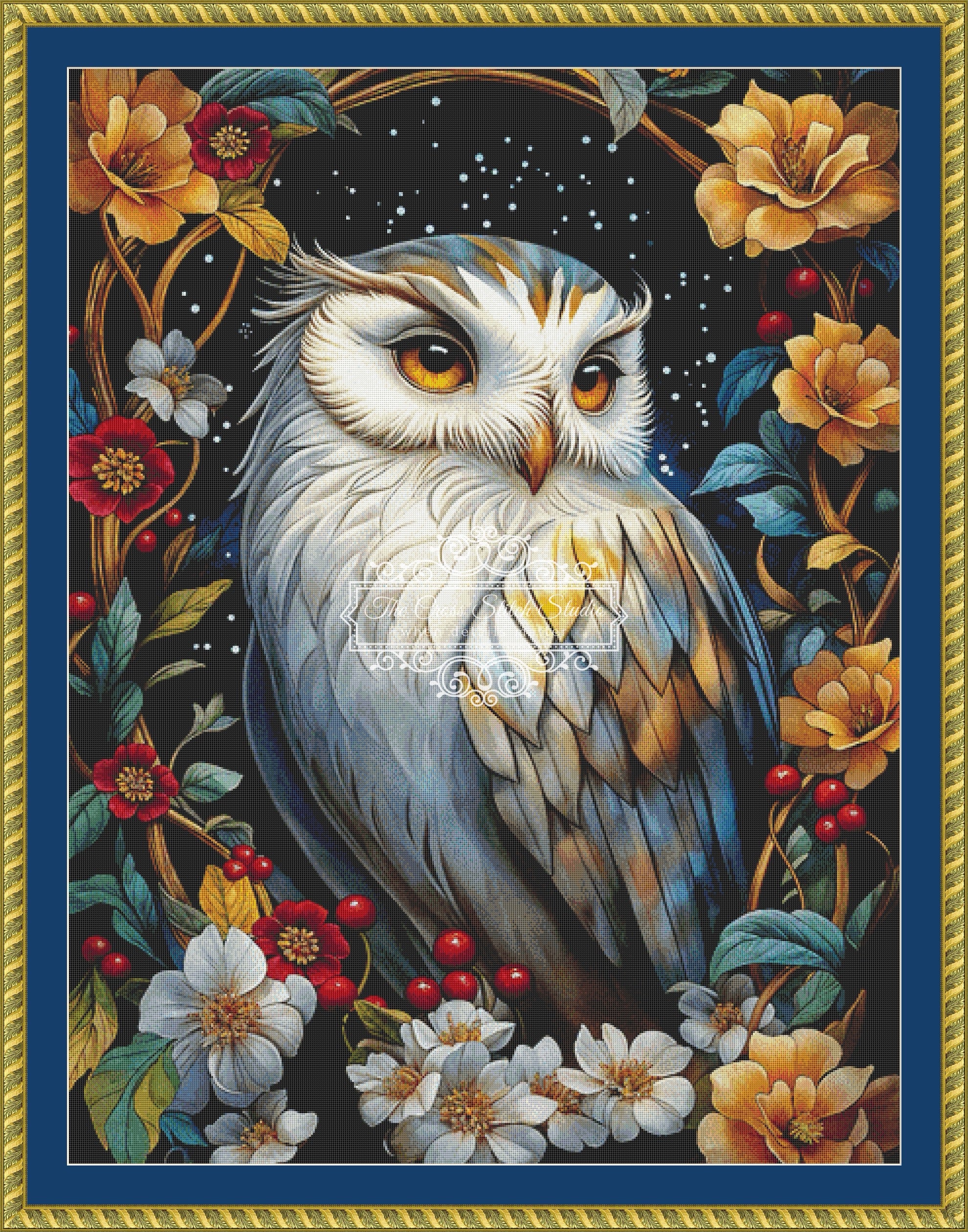 Our full coverage cross stitch pattern Orionis highlights a watchful owl framed by luminous night‑sky tones, vibrant blossoms, and rich woodland detail for a striking, atmospheric portrait.