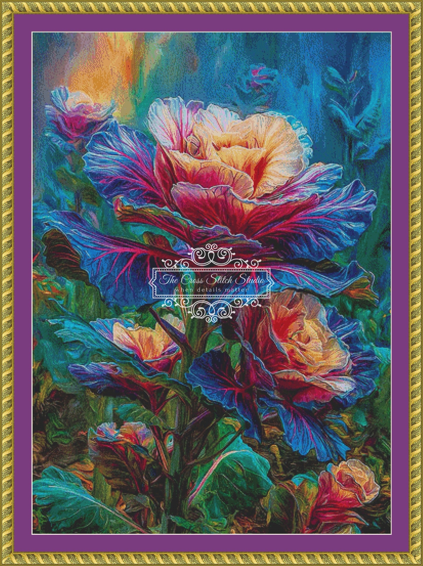 Our cross stitch pattern, Prismatic Kale, is a kaleidoscope of color and texture that transforms ornamental cabbage into a painterly spectacle. With ruffled leaves in jewel-toned purples, reds, blues, and golds, it’s a celebration of botanical beauty - bold, surreal, and unmistakably rich. Designed for stitchers who crave full coverage and visual drama.
